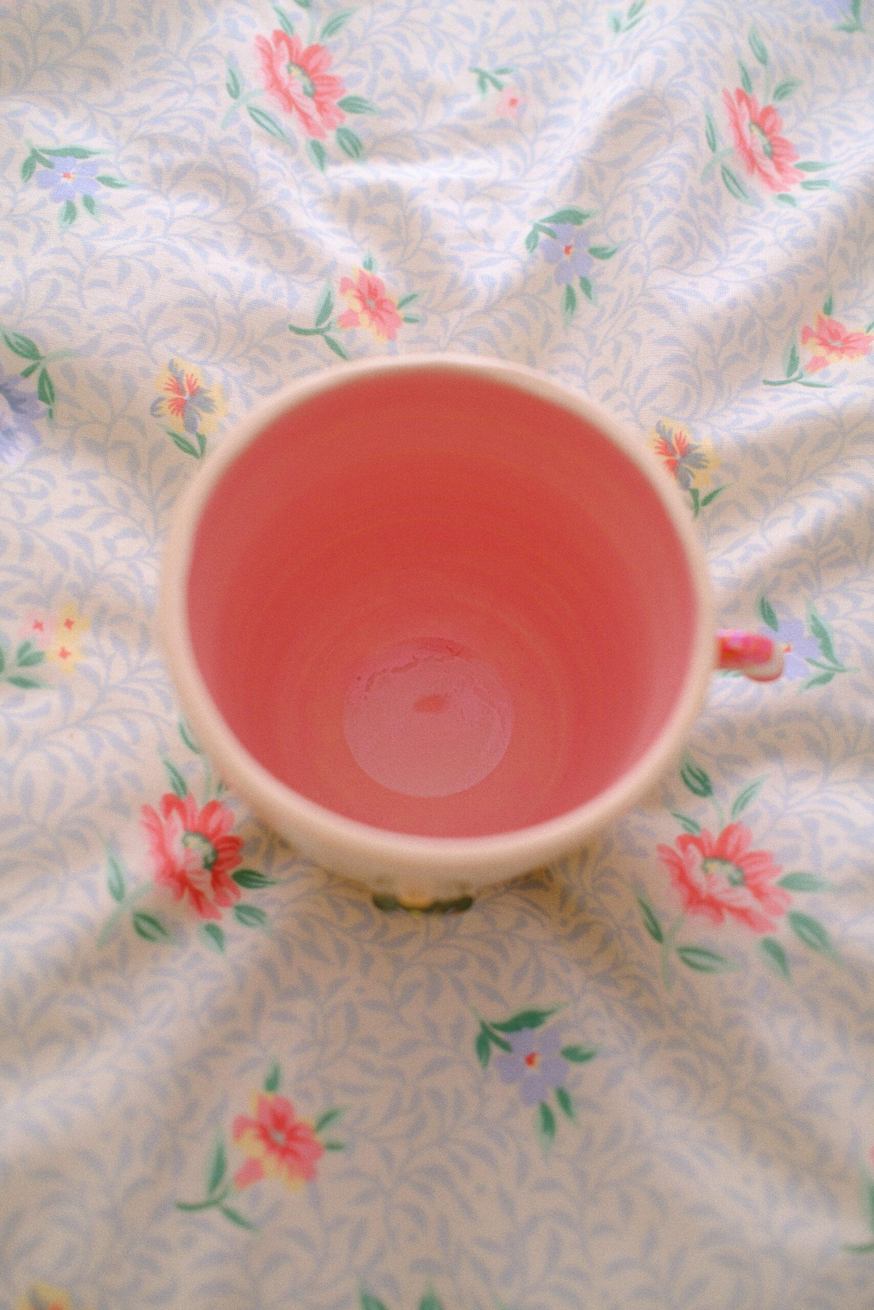 Cette pièce a été tournée sur le tour par mes petites mains ! Elle a ensuite séché pendant plusieurs jours sur mes étagères avant d’aller au four pour la première cuisson (dite « biscuit ») de 24 heures. Je l’ai ensuite décorée avec mes engobes, puis émaillée pour la deuxième cuisson de 24 heures également !