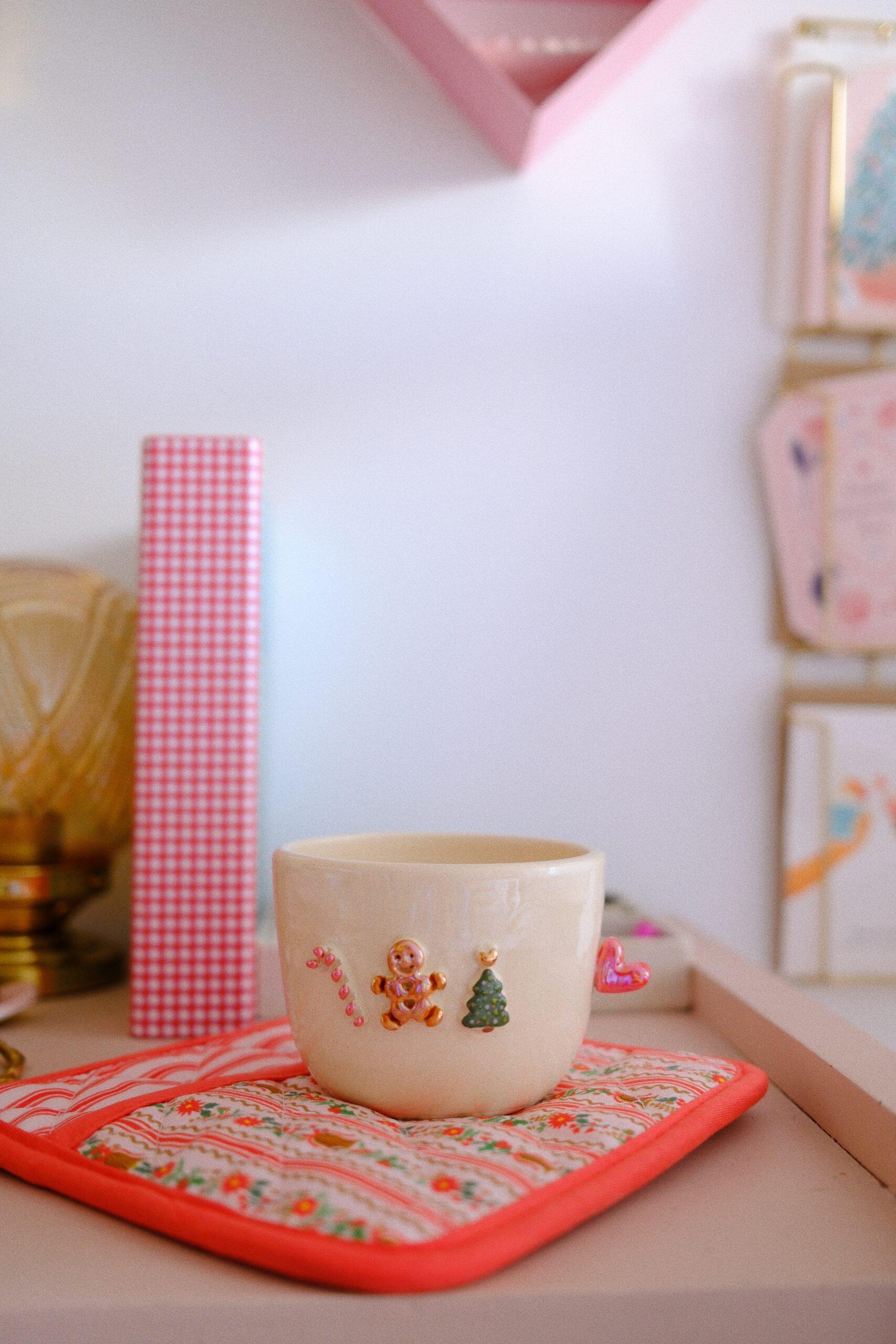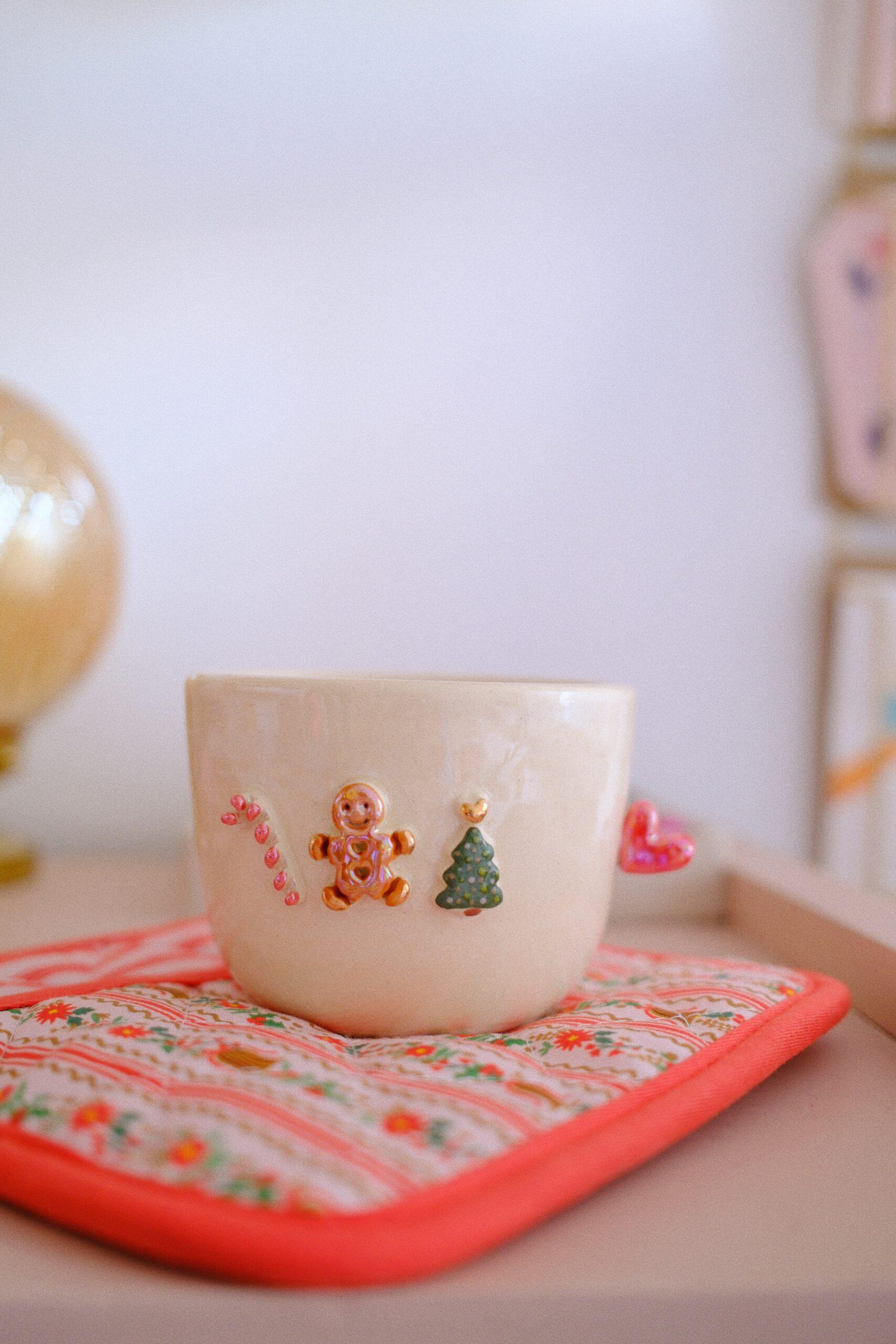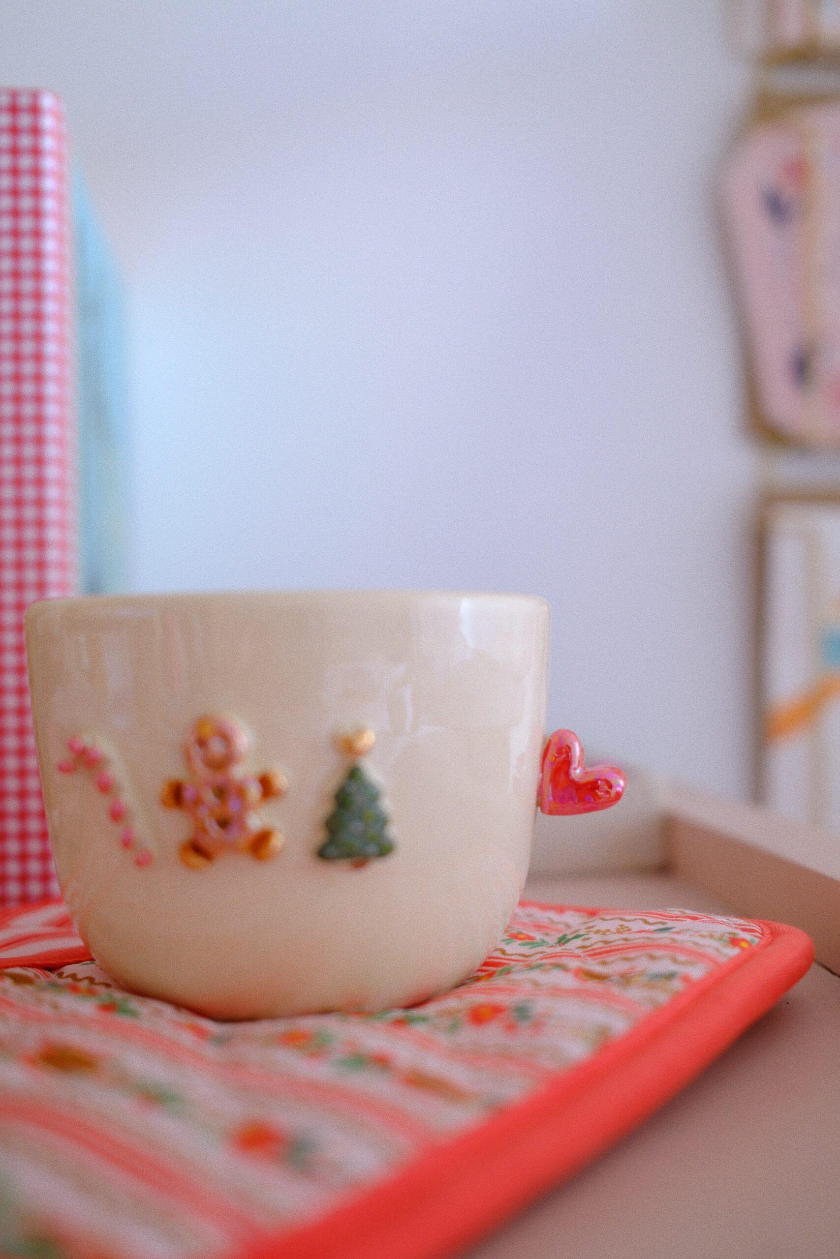 Cette pièce a été tournée sur le tour par mes petites mains ! Elle a ensuite séché pendant plusieurs jours sur mes étagères avant d’aller au four pour la première cuisson (dite « biscuit ») de 24 heures. Je l’ai ensuite décorée avec mes engobes, puis émaillée pour la deuxième cuisson de 24 heures également !