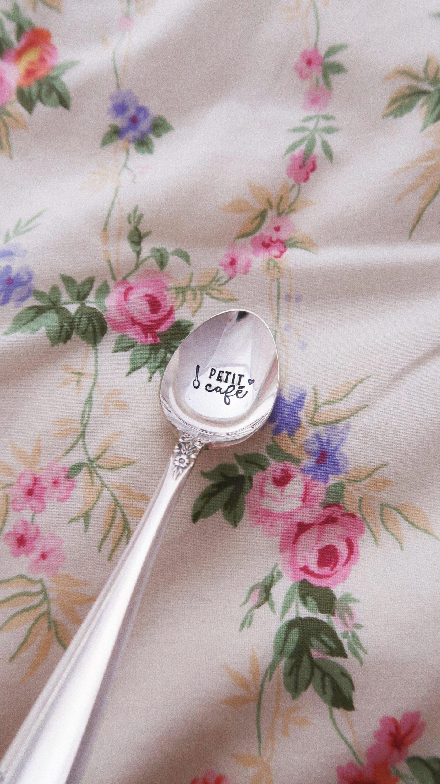 L’encre que j’utilise afin de faire ressortir le message est non toxique. Mes petites cuillères sont destinées à un usage occasionnel, la gravure durera toute la vie mais l’encre finira par s’atténuer : évitez donc le lave vaisselle autant que possible !